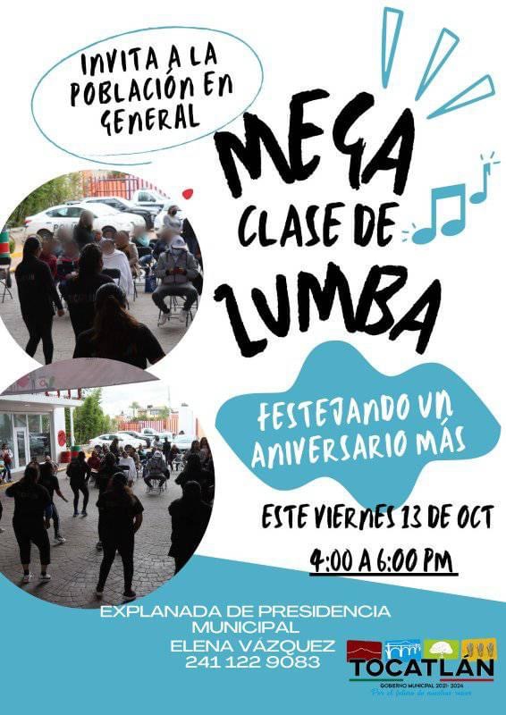 El gobierno Municipal de Tocatlán invitan a la población en General a la mega clase de zumba la cual se desarrollará este viernes 13 de octubre en la explanada de la presidencia municipal.
