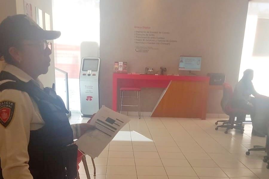 La tarde de este lunes se recibe una llamada a los números de emergencia, donde se reporta la presencia de presuntos asaltantes al interior de una institución bancaria, por lo que elementos de la policía municipal, se trasladan de manera inmediata al lugar.