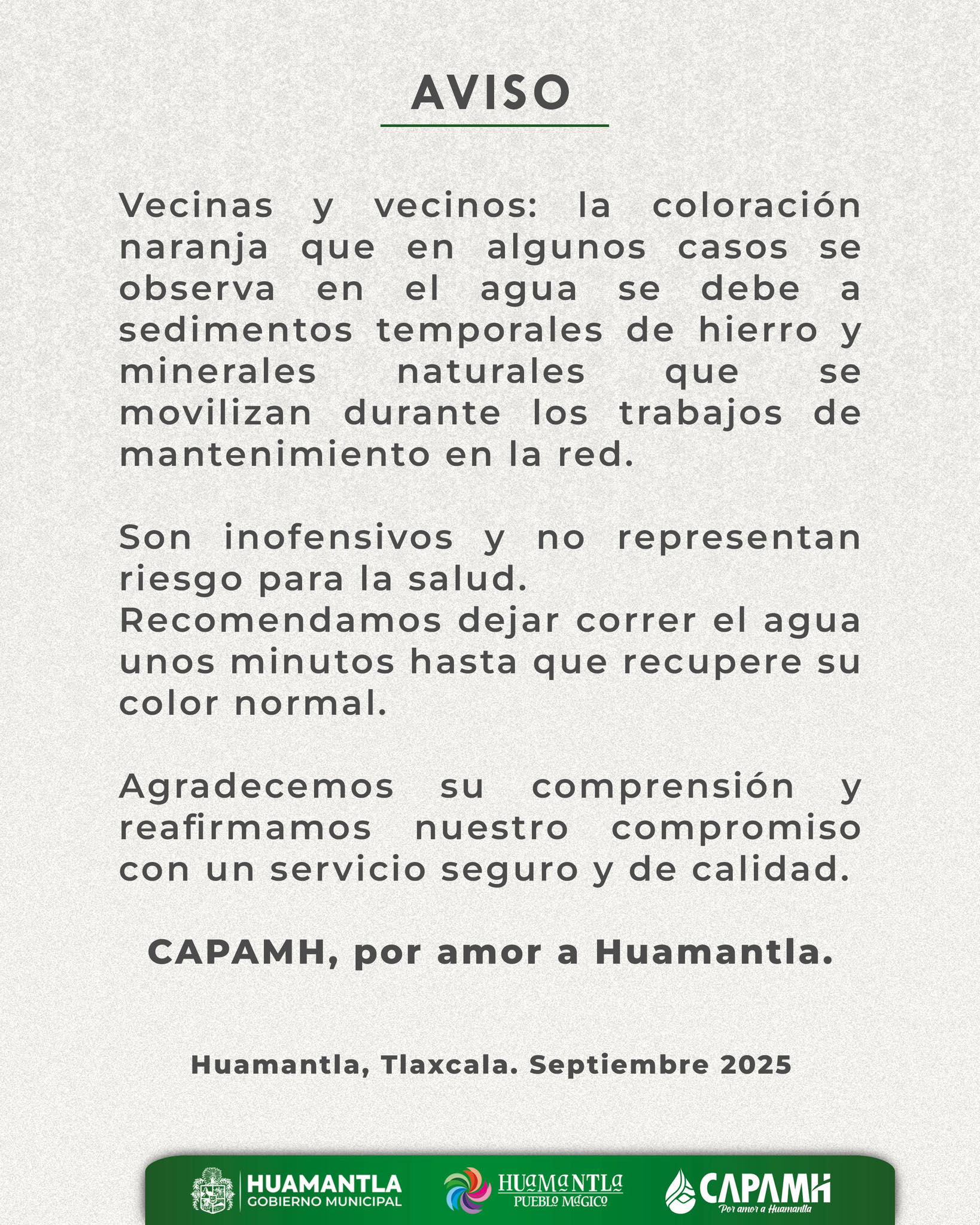 La Comisión de Agua Potable y Alcantarillado del Municipio de Huamantla (CAPAMH) informa a la ciudadanía que, derivado de los trabajos de mantenimiento en la red hidráulica, en algunas zonas del municipio se ha detectado una ligera coloración naranja en el agua.