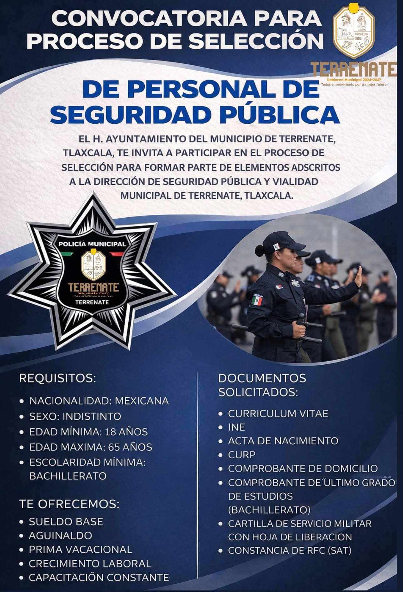 Con la finalidad de continuar reforzando la seguridad en el municipio de Terrenate, el ayuntamiento que encabeza, Filo Palafox, ha aperturado la convocatoria para pertenecer a las fuerzas municipales.