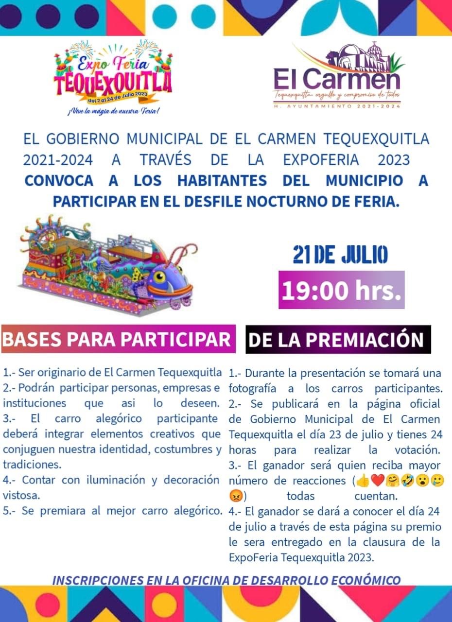 El gobierno municipal de Tequexquitla, que encabeza, Araceli Martínez Cortez, invita a comercios y público en general a participar en el desfile nocturno de feria.
